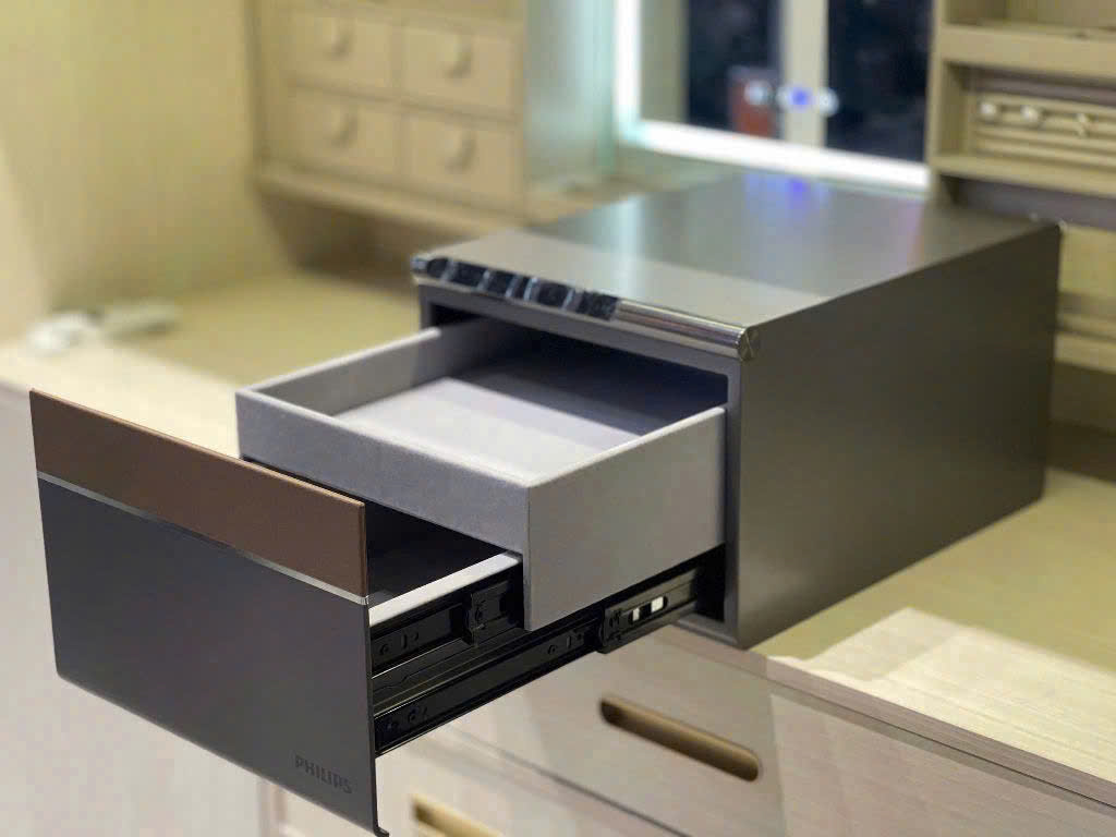 Ngăn kéo bên trên là ngăn kéo chính, được mở ra ngay sau khi nhập đúng vân tay hay mã số. Ngăn kéo phụ bên dưới là ngăn kéo ẩn, giúp bạn lưu trữ những đồ cần sự kín đáo và riêng tư hơn.