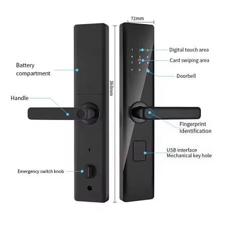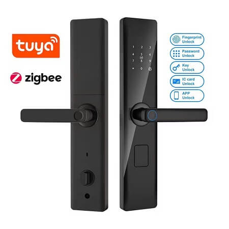Khoá  sử dụng 5 tính năng để mở khoá: Vân tay, mã số, thẻ từ, chìa cơ, app Tuya wifi. Với dung lượng lưu trữ lớn: 100 vân tay/mã/thẻ.