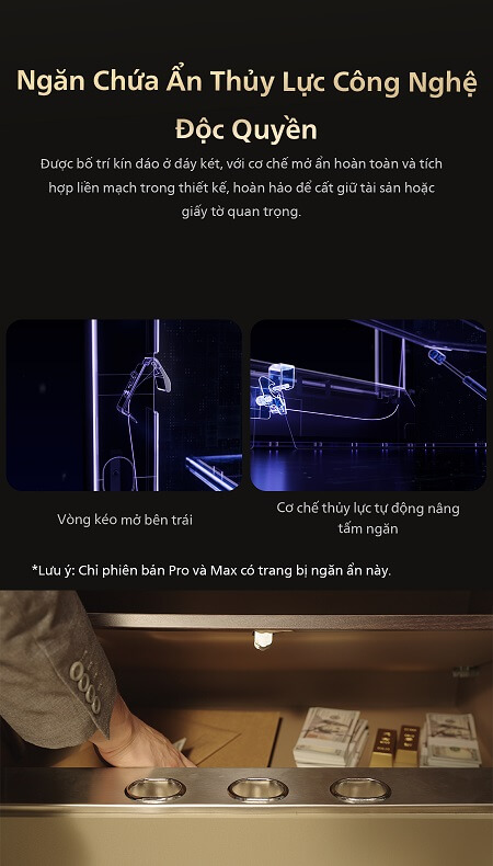Ngăn ẩn được bố trí kín đáo ở đáy két, tích hợp cơ chế mở ngầm thông minh kết hợp hệ thống nâng thủy lực tự động, giúp tấm ngăn mở ra nhẹ nhàng, êm ái, tạo nên một không gian lưu trữ riêng tư tuyệt đối cho tài sản, giấy tờ hoặc vật phẩm có giá trị cao.